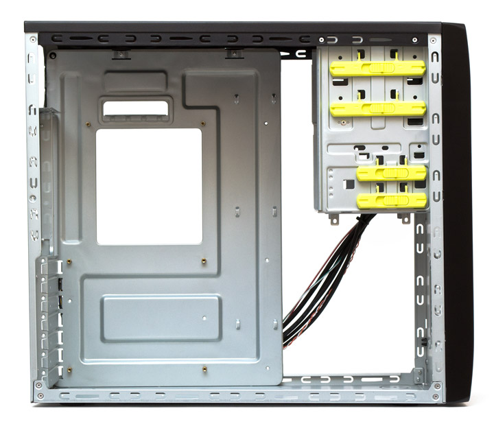 Два 5,25″ отсека и корзина для двух 3,5″ накопителей оборудованы подпружиненными защелками для быстрого монтажа без использования винтов. Между отсеками уже при помощи винтов можно закрепить любое внешнее 3,5″ устройство, а под корзиной есть крепления для одного 2,5″ диска.
