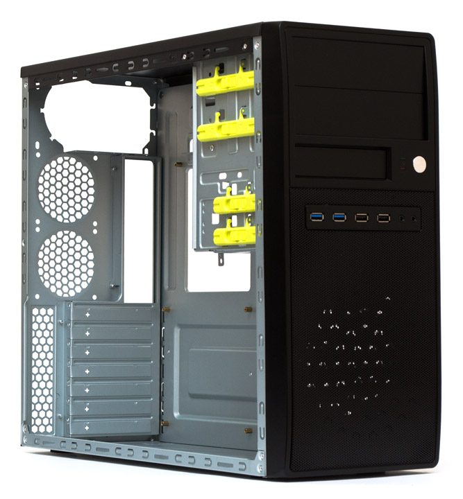 Дизайн корпуса предельно прост. Это правильная стальная коробка черного цвета с ровной пластиковой передней панелью. В верхней части есть два отсека под устройства формата 5,25″ и один под 3,5″. Большая половина фронта снизу занята металлической решеткой с мелкими ячейками.