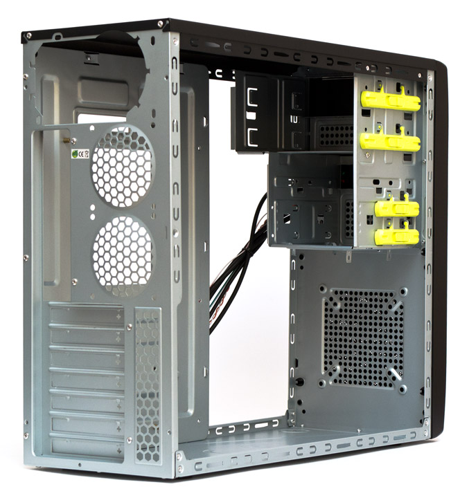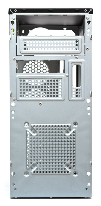 Сзади все выглядит почти стандартно. Вверху — посадочное место под блок питания (возможна ориентация исключительно вентилятором вниз). Внизу — семь слотов расширения PCI, закрытых одноразовыми заглушками. Справа от них находится небольшая вертикальная вентиляционная решетка. Посередине задней панели расположены две круглые решетки под 80-мм вентиляторы. Нужно отметить, что в наше время это крайне редкое решение, в некотором роде даже атавизм.