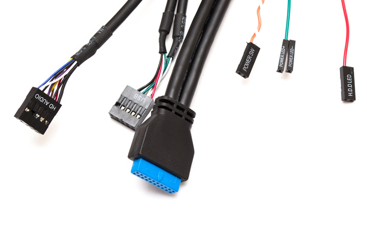 В набор кабелей от корпуса входит: разъем HD Audio, колодка USB 2.0, коннектор USB 3.0, три провода от кнопок запуска системы, индикатора питания и работы накопителей. Клавиша перезапуска системы и провод от нее отсутствует.
