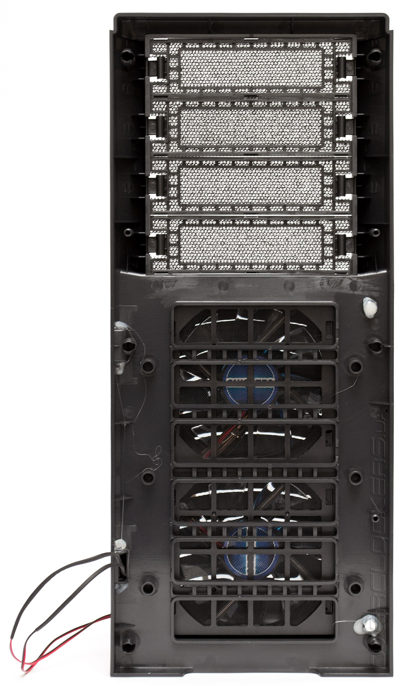 Если у пользователя возникнет желание снять переднюю панель, предварительно следует отключить вентиляторы от плат горячей замены. После это можно поочередно вытолкнуть шесть креплений типа тюльпан, и потянуть фронт на себя за выемку снизу. При взгляде на обратную сторону становится очевидной экономия производителя — петли и магниты передней дверцы зафиксированы с помощью клея.