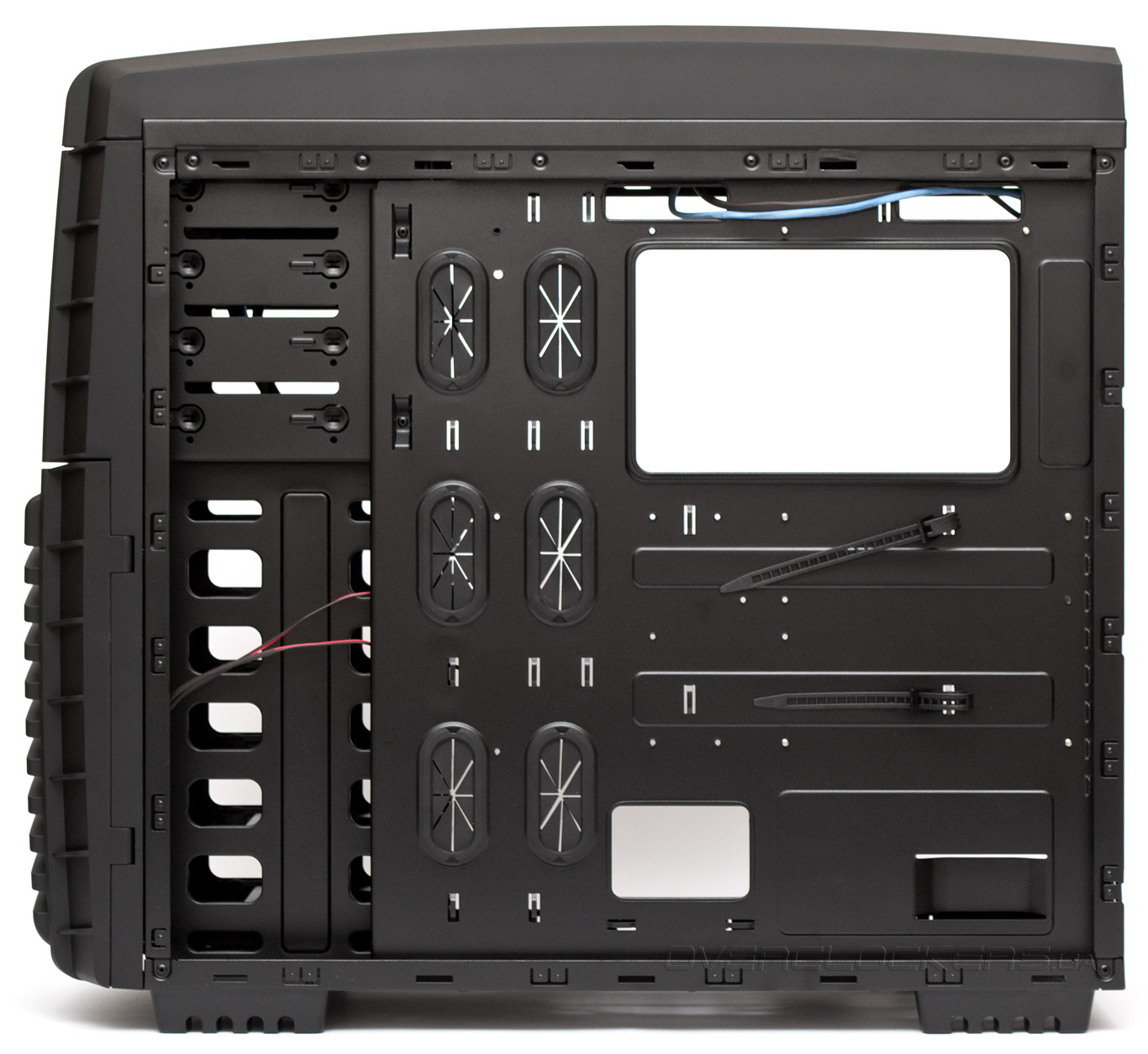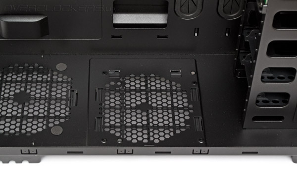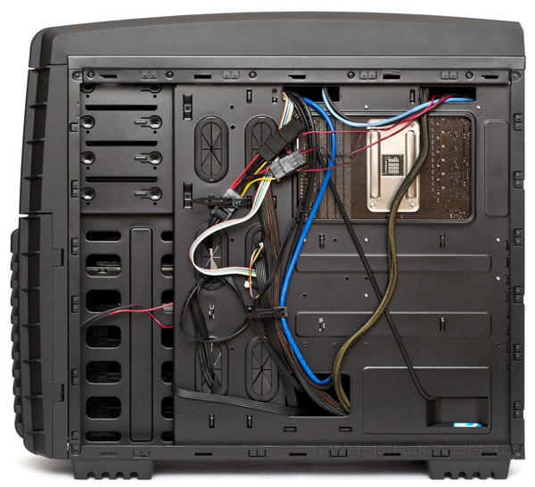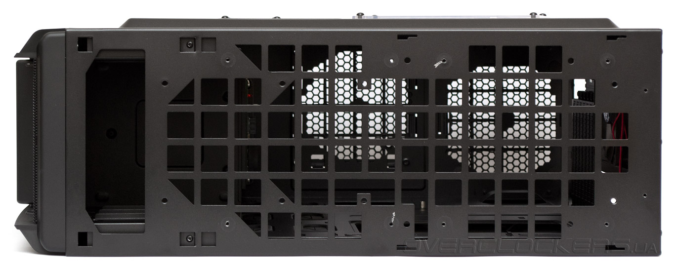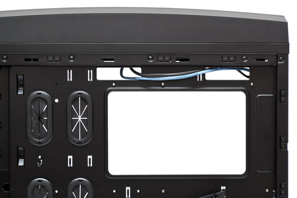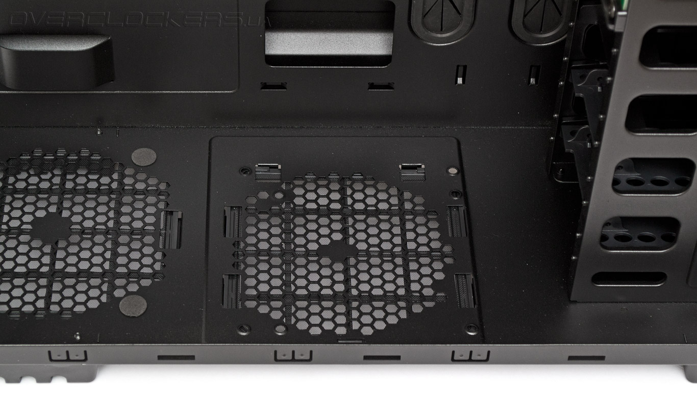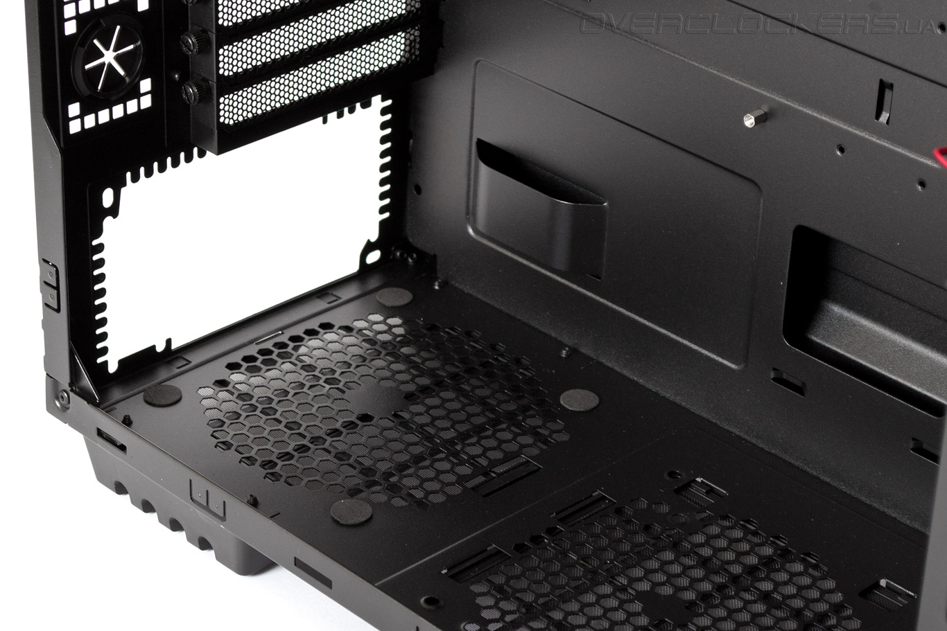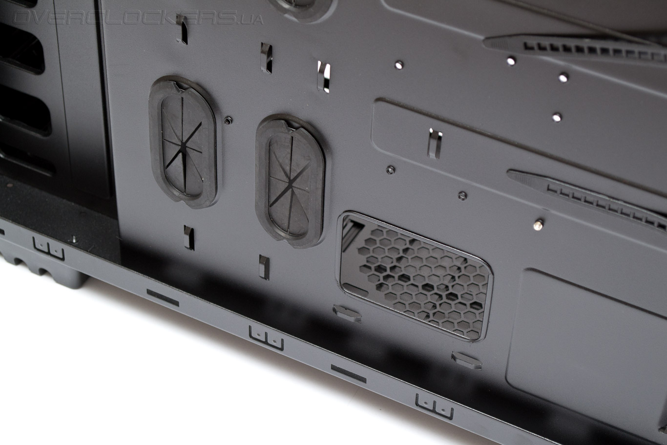 На поддоне шасси есть шесть прорезиненных отверстий для протяжки проводов в центральной части, два выреза слева и справа над местом расположения процессорного разъема и квадратное окно снизу, для шлейфов блока питания.