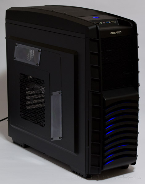 Начнем наш обзор Chieftec Dragon DX-02B с передней панели. Характерные кривые прорези в нижней фронтальной части это, пожалуй, единственная деталь, внешне напоминающая о предшественнике — DX-01. В целом корпус был переделан кардинально. Скошенные треугольные элементы в дизайне передней панели, похожие на танковые гусеницы, вероятно, позаимствованы у серии HAF компании Cooler Master.