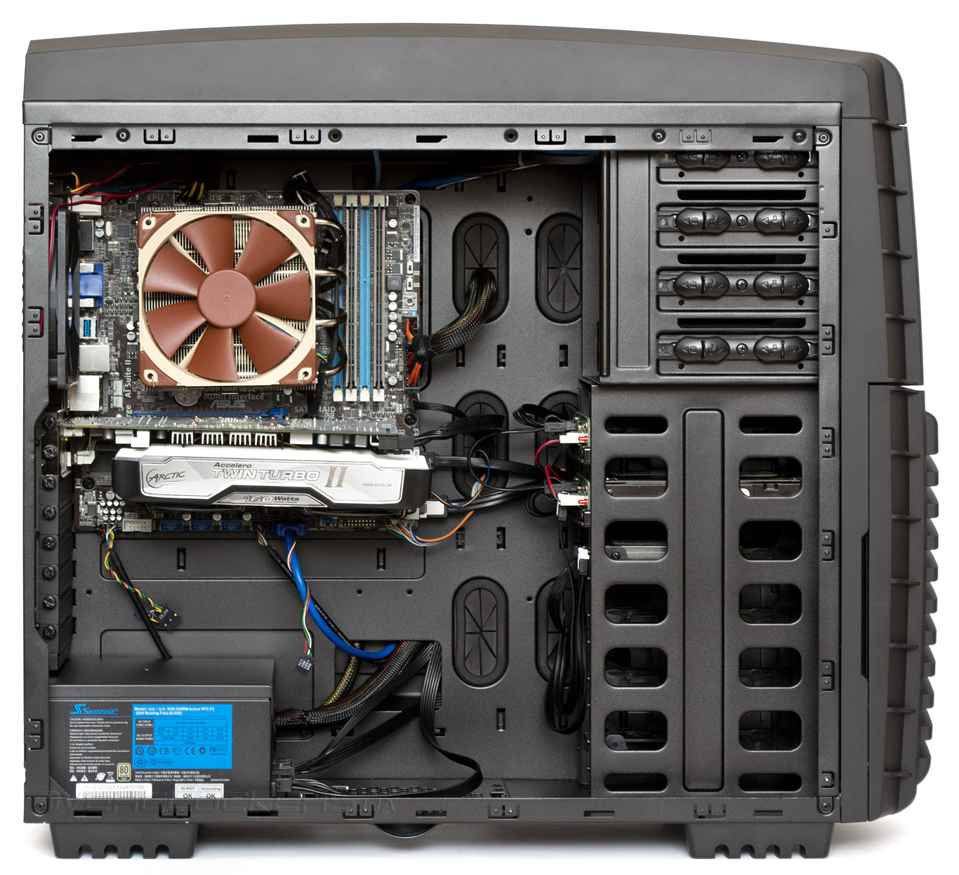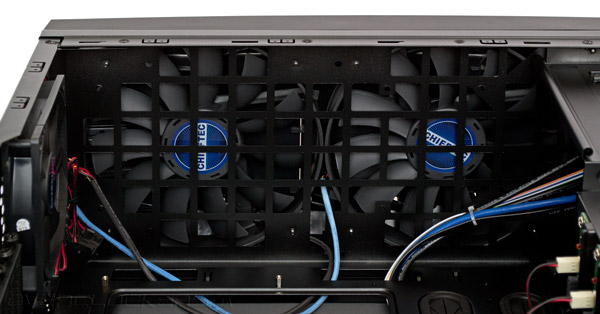 Главными ответственными за охлаждение корпуса являются два 200-мм вентилятора, установленных на выдув, за решетчатой верхней панелью.