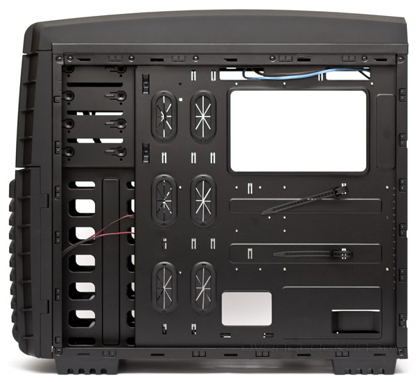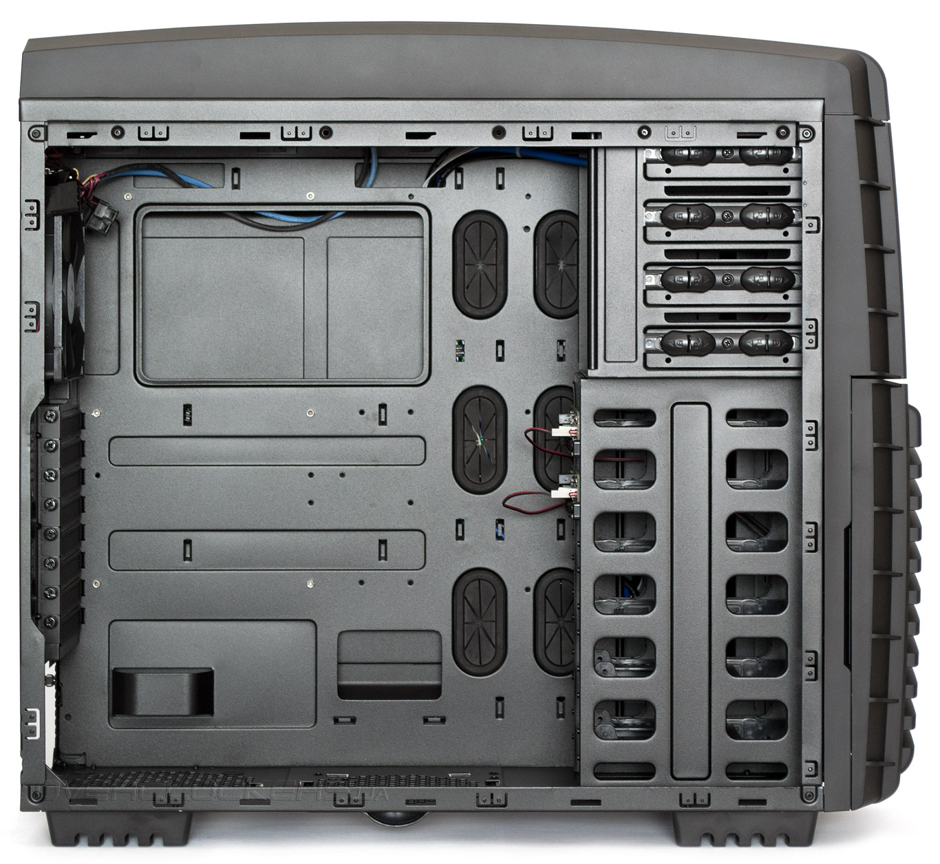 Левая панель имеет аналогичную выштамповку. Посадочное место для 195-мм вентилятора выглядит здесь весьма уместным. Жаль только что отсутствует пылевой фильтр.
