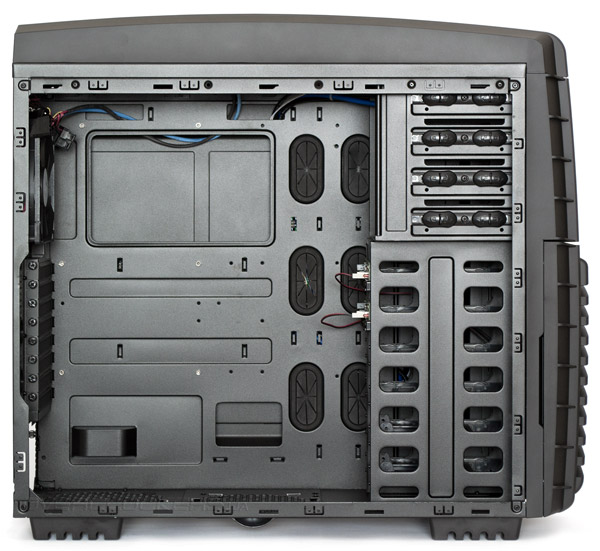 В переднюю стойку можно установить четыре устройства 5,25” и шесть дисков 3,5”. Корзины HDD развернуты вдоль корпуса и расставлены с приличным зазором между собой, что должно позитивно сказываться на температурном режиме накопителей.