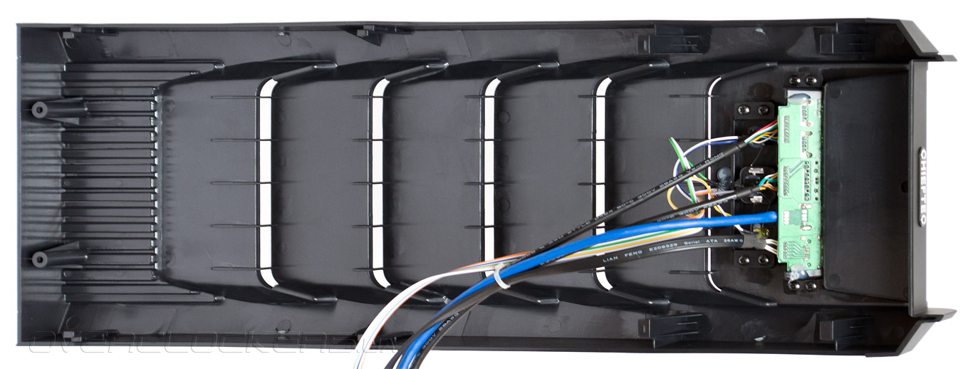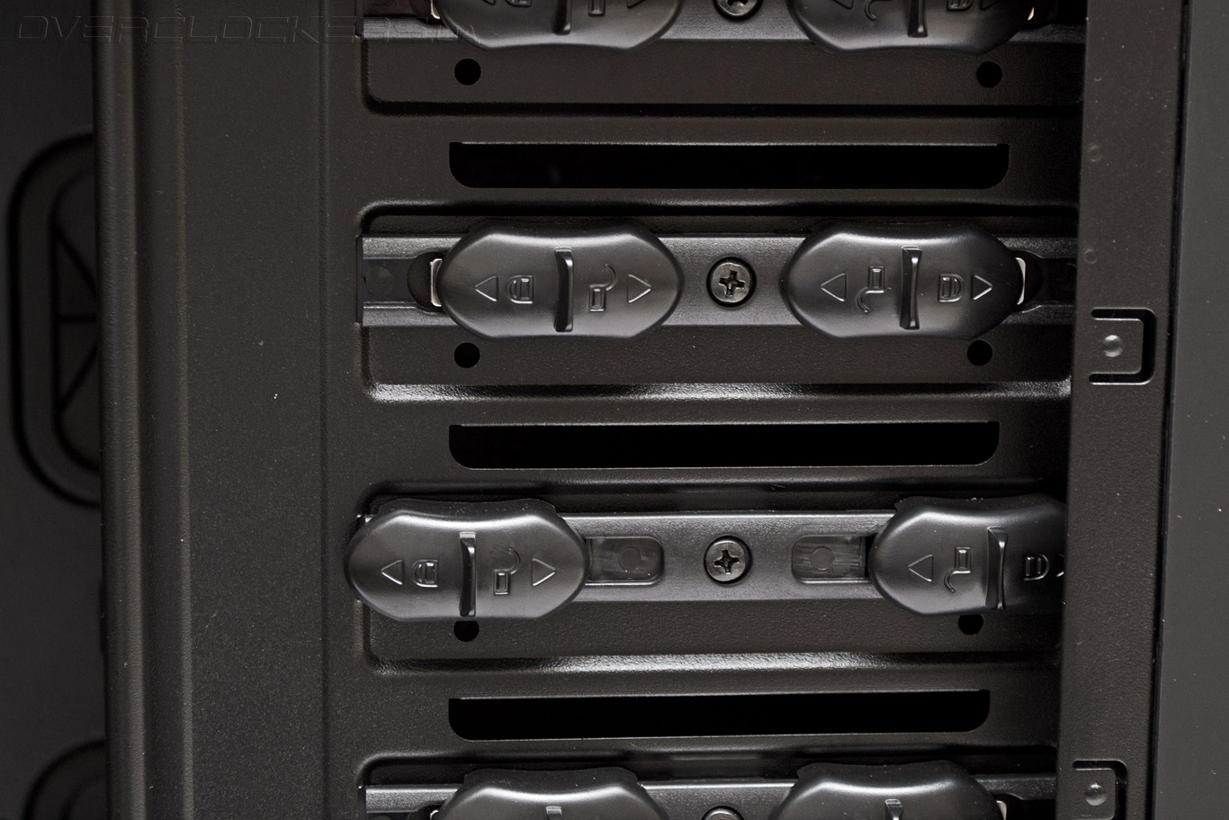В отсеках 5,25” предусмотрены как безвинтовые крепления, так и отверстия под обычные винты. По принципу работы они напоминают скоросшиватель для документов. Раздвинув ползунки в стороны, мы фиксируем устройство, сдвинув к середине — освобождаем крепления.