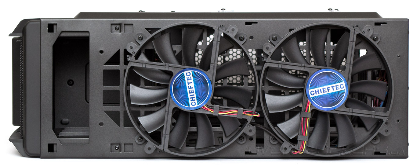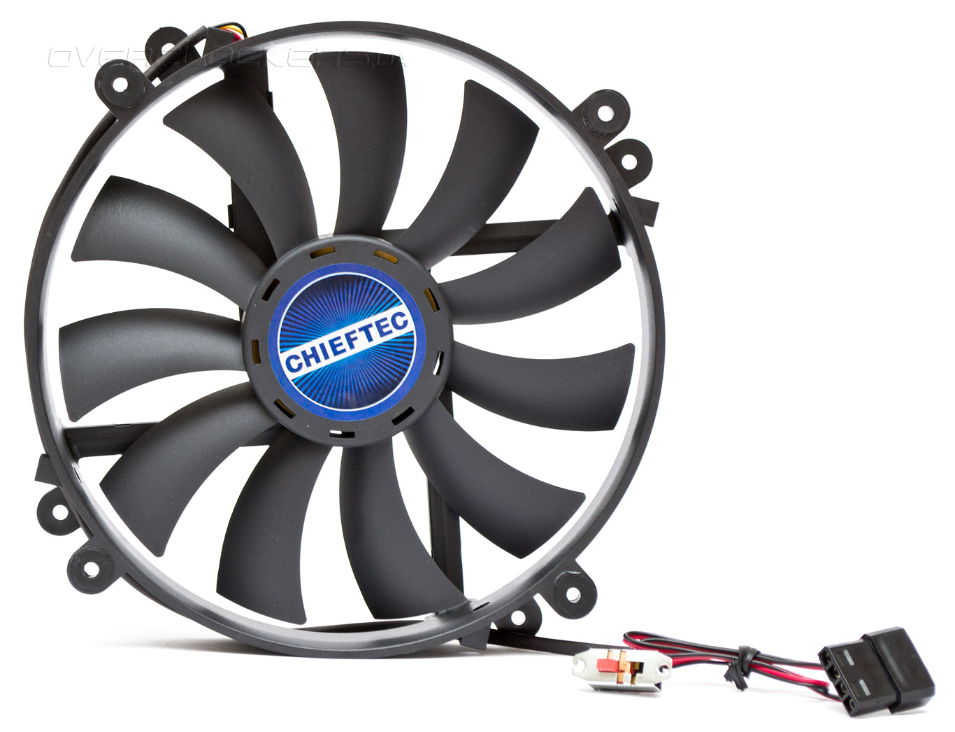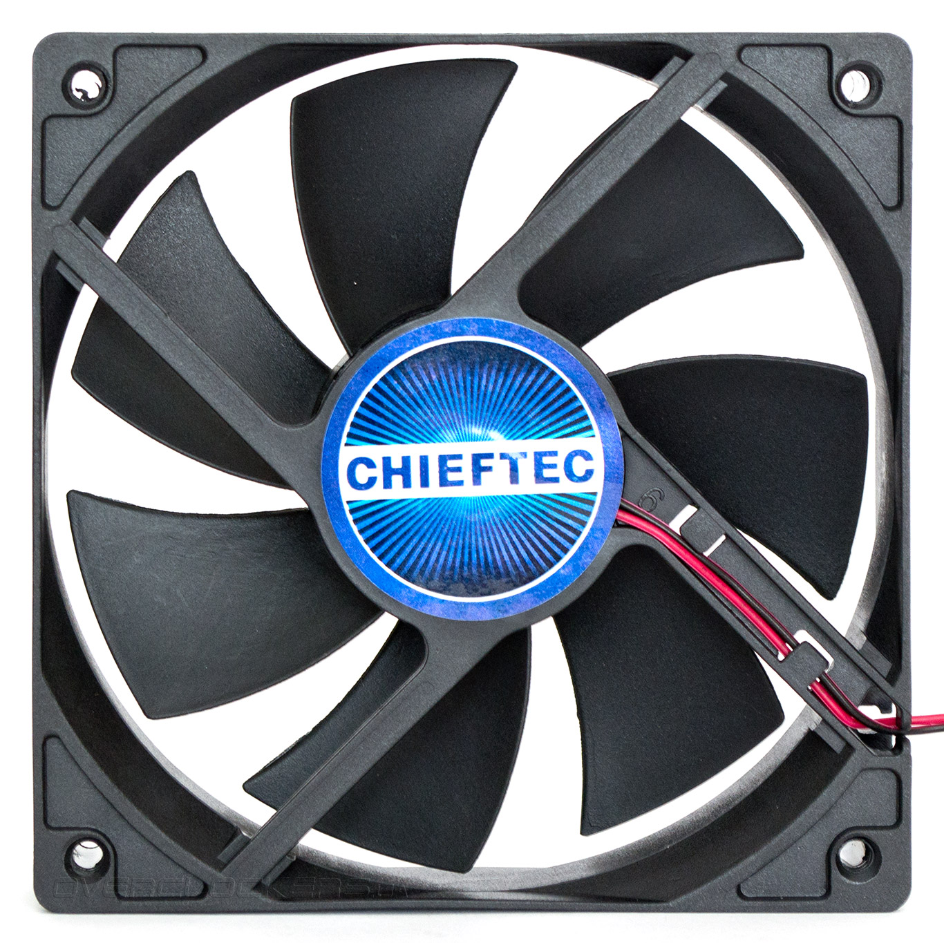 Задний вытяжной вентилятор является такой же загадкой, как и его старшие собратья. Ничего, кроме наклейки Chieftec на статоре нет. Подключение к питанию — через сквозной разъем типа «молекс».