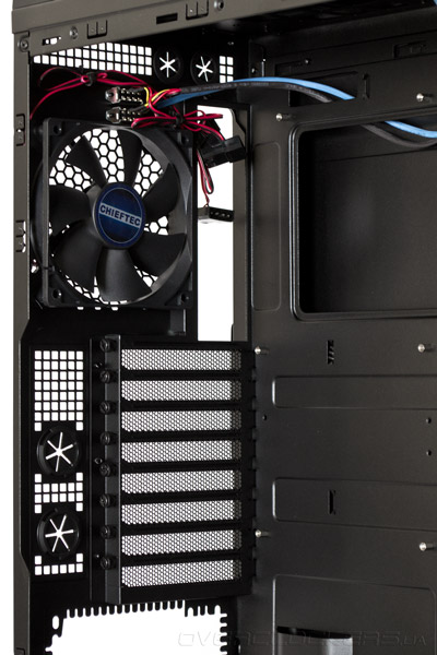 Шасси поддерживает восемь карт расширения. Все слоты закрыты многоразовыми вентилируемыми заглушками. Справа от слотов, на вентиляционной решетке есть еще два прорезиненных отверстия под шланги СВО диаметром 25 мм. Блок питания можно установить вентилятором вверх либо вниз.