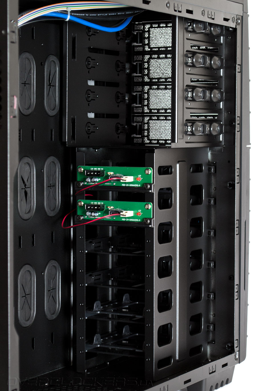 Корпус обладает двумя встроенными контроллерами верхних 200-мм вентиляторов. Переключатели имеют три позиции: «L» — пониженные обороты, «H» — полная скорость и «O» — выключено. Интересная и удобная конструкция, одно единственное но — контроллеры припаяны к проводке вентиляторов.