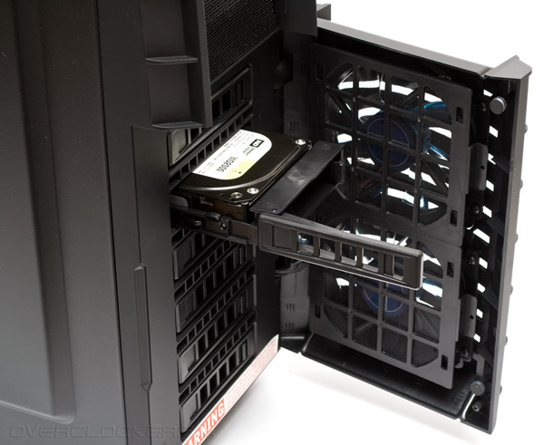 Но открыв дверцу вправо, сразу понимаешь, каким образом воздух попадает внутрь — вентиляционные щели видны на просвет. Непосредственно на двери установлены два 120-мм вентилятора, прикрытые пылевыми фильтрами и предназначенные для обдува накопителей. Всего сюда можно установить шесть дисков в индивидуальных каретках. Система закрывания этих салазок запатентована компанией Chieftec, хотя в целом они очень похожи на стандартные корзины от серверного оборудования.