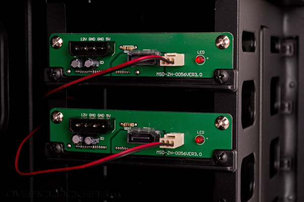 Два верхних отсека оборудованы платами горячего подключения 3,5” дисков. Держатся они на четырех винтах, при желании их можно прикрепить напротив любой из шести корзин в стойке. Питается плата от разъема «молекс». Здесь же распаяны подключения для сигнального кабеля SATA и трехконтакный разъем для питания вентилятора. Красный светодиод загорается в случае успешного подключения накопителя.