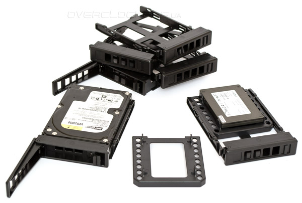 Корзины рассчитаны исключительно на диски формата 3,5”, но в комплекте есть два переходника для 2,5” устройств. К сожалению, подключить SSD к плате горячей замены с помощью такого переходника физически невозможно. Демпферов вибраций в салазках нет, накопители можно просто вставить в них, либо дополнительно зафиксировать винтами.