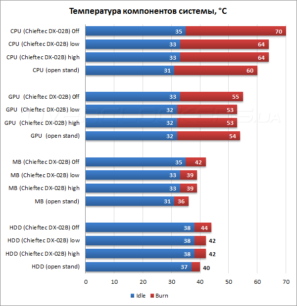 Результаты теплового теста стали легким сюрпризом для нас. Мы ожидали увидеть более низкие температуры, учитывая размеры и количество предустановленных вентиляторов. Но обо всем по порядку. Хуже всего шасси показывает себя в охлаждении жесткого диска. Похоже, что большое количество препятствий на пути движения воздуха к накопителям приводит к постыдному проигрышу в сравнении с открытым стендом. Температура материнской платы оставляет желать лучшего, но укладывается в эмпирическую норму из трех градусов разницы между открытым/закрытым корпусом. Видеокарта чувствует себя отлично, из чего следует, что Chieftec Dragon DX-02B вполне можно рекомендовать для конфигураций с несколькими видеоадаптерами. Температура процессора закономерно высока при отключенных верхних вентиляторах, но при включенных превышает таковую на открытом стенде всего на четыре градуса. Аномалия, которую возможно заметили внимательные читатели, состоит в том, что показатели температуры равны при повышенных и пониженных оборотах 200-мм вентиляторов. Рискнем предположить, что объяснение кроется в структуре верхней пластиковой панели, точнее, в суммарной площади вентиляционных отверстий на ней, которая не превышает половины от поперечного среза плоскости 120-мм вентилятора. Отсюда следует, что мощность 200-мм «вертушек» расходуется впустую — конструкция верхней крышки сильно снижает объем прокачиваемого воздуха и скорость потока. По грубым подсчетам — в пять раз. Это значит, что в стоковом варианте нет смысла устанавливать режим вращения больших пропеллеров в «High» и слушать дополнительные звуковые эффекты. При режиме «Low» мы получим меньший уровень шума при одинаковой эффективности охлаждения.
