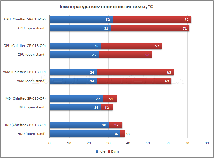 В тепловом тесте Chieftec GP-01B-OP показал себя на удивление хорошо, даже с учетом не полного комплекта вентиляторов. Процессор по температуре уступил всего один градус открытому стенду. Видеокарта нагрелась на пять градусов сильнее, что тоже вполне приемлемо. Разница в температуре силовых цепей и материнской платы колебалась в пределах одного-двух делений ртутного столба. Жесткий же диск охлаждался в нагрузке лучше на один градус, зато в простое отыграл сразу шесть. Одним словом — система вентиляции в данном шасси очень даже достойная.