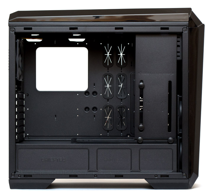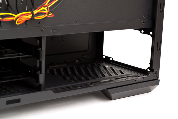 В передней части днища корпуса, есть большой запас свободного пространства, поскольку отсутствуют корзины жестких дисков, и даже крепления для двух 5,25″ устройств максимально укорочены. Благодаря этому, в Chieftec GP-01B-OP можно без проблем устанавливать самые большие видеокарты и материнские платы формата E-ATX и, возможно, даже некоторые серверные форматы материнских плат. Кроме того, впереди комфортно разместится 240- или 280-мм радиатор СВО любой толщины.