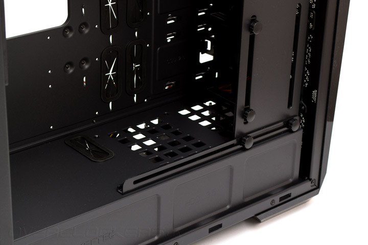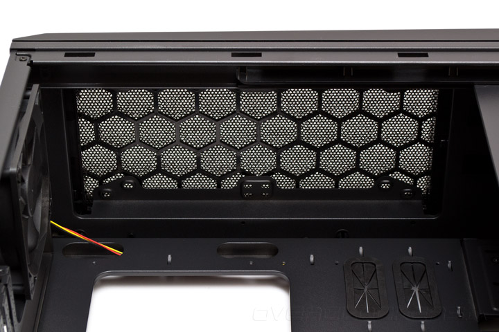 Всю нижнюю часть корпуса занимает сплошной несъемный кожух, закрывающий собой блок питания и корзины накопителей. В его передней части есть две крупные решетки для вентиляции жестких дисков, а посередине — прорезиненное отверстие для протяжки кабелей. С большой долей вероятности, данный кожух имеет сугубо декоративное назначение, поскольку выполнять функцию разделения термальных зон он не способен. Еще в передней части установлены рельсы с крупной боковой планкой поддержки видеокарт. Сама планка двигается по горизонтали почти на всю длину шасси и фиксируется двумя винтами с накатанной головкой. Два поперечных упора тоже держаться на винтах с накатанной головкой и их высоту можно отрегулировать под любой из семи слотов расширения PCI. Пожалуй — это лучший вариант реализации упоров для видеоадаптера из всего, что доводилось мне встречать за последнее время.