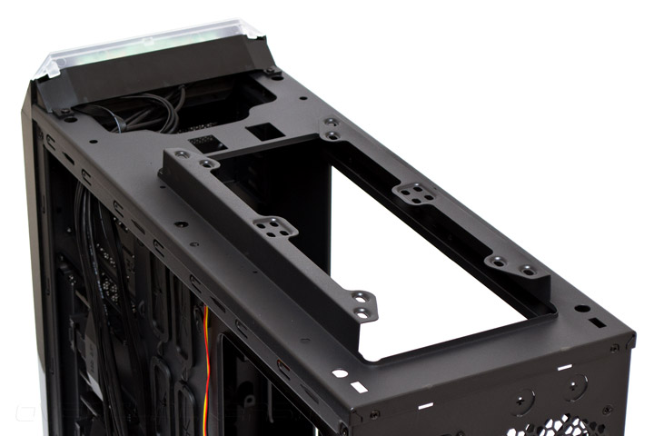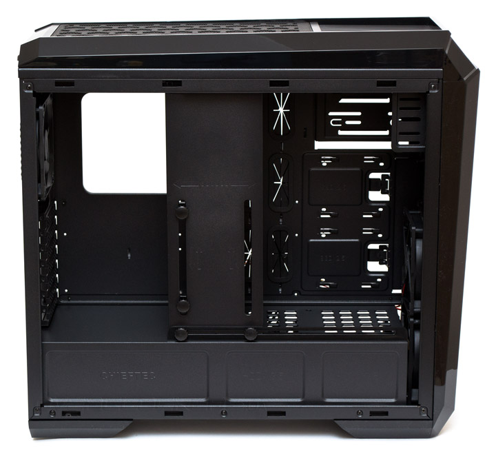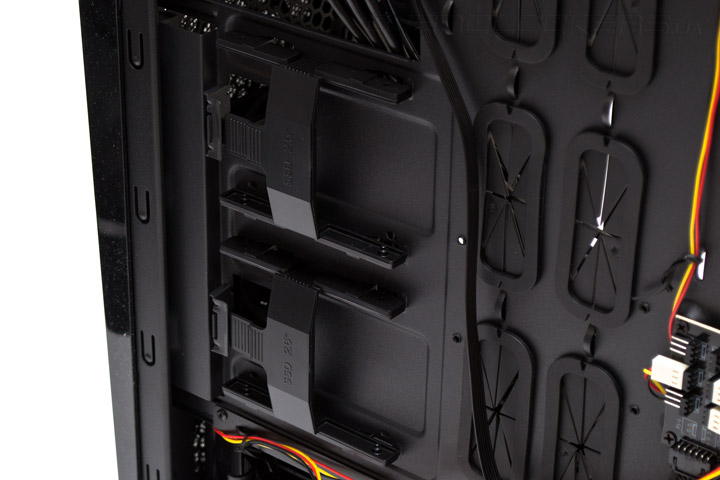 В сплошном поддоне материнской платы, который выполняет, в том числе, и роль мощного ребра поперечной жесткости для корпуса, есть много интересного. Прежде всего — это вырез для усилительной пластины процессорного кулер, который подойдет под расположение любого современного сокета CPU. Для протяжки кабелей есть шесть прорезиненных отверстий посередине и два открытых — вверху поддона. Проушин для крепления кабельных стяжек насчитывается 15 штук и расположены они в нужных местах. Запас пространства от поддона до боковой дверцы составляет 20 мм, чего обычно хватает для аккуратной укладки проводов.
