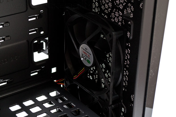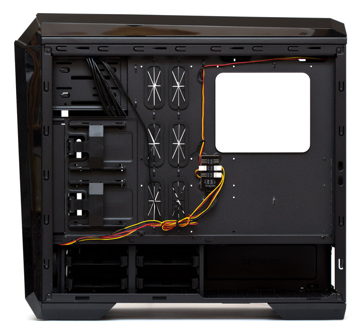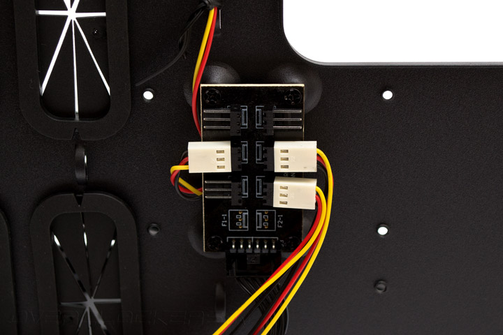 Корпус оборудован платой контроллера скорости вращения для шести трехконтактных вентиляторов. Судя по инструкции, на них может подаваться два вида напряжения — 7 и 12 В. Режим отключения не предусмотрен. Максимальная сила тока на подключаемых пропеллерах не должна превышать 0,3 А на каждую вертушку.