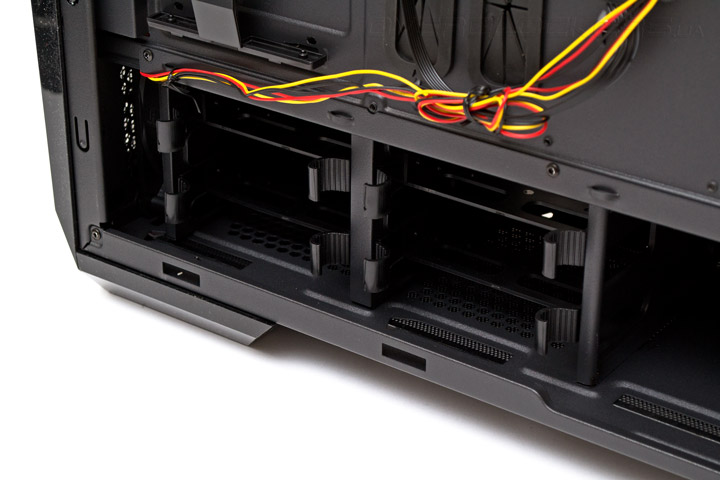 Четыре пластиковых лотка для 3,5″ или 2,5″ накопителей расположены попарно и в нижней передней части корпуса. Хотя они и выглядят невентилируемыми на первый взгляд, это впечатление обманчиво. На самом деле вентиляционные отверстия есть над ними и под ними, а спереди накопители обдуваются предустановленным 120-мм вентилятором.