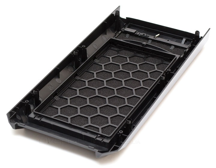 При нажатии на переднюю часть решетки, она легко снимается и открывает удобный доступ внутрь. С обратной стороны тоже проложен поролон. На салазки под данным фильтром можно установить два 120- или 140-мм вентилятора.