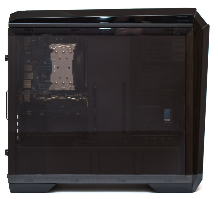 Наиболее интересная часть во внешнем дизайне корпуса это его левая боковая панель. Она сделана полностью из тонированного плексигласа и через нее хорошо просматривается интерьер шасси. Похоже, что подобные дверцы — это новый тренд в индустрии, поскольку такие модели попадаются мне все чаще.