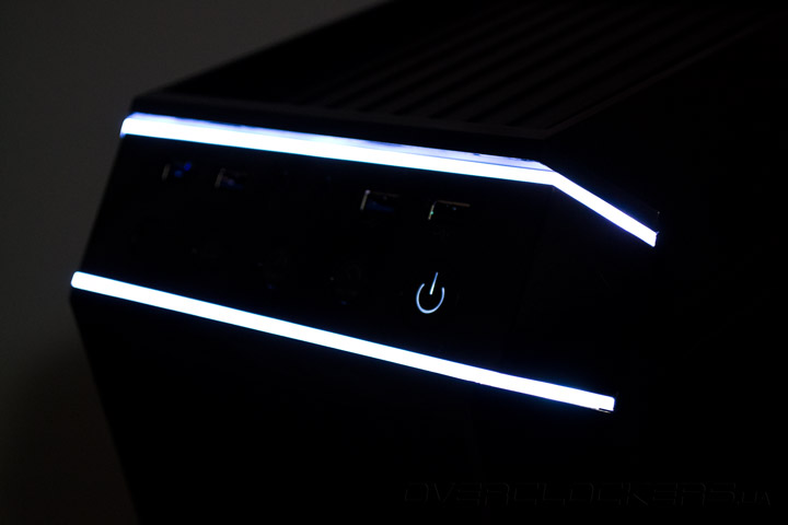 Панель внешних интерфейсов, которая находится на скошенной передней грани между верхней и фронтальной панелью, выглядит весьма насыщенно. Две полоски из прозрачного пластика сверху и снизу — это цветные светодиоды. В верхнем ряду собрано по две пары разъемов USB 2.0 и USB 3.0, максимально удаленных друг от друга, а между ними есть два 3,5-мм аудиопорта для микрофона и наушников. Большая круглая кнопка включения с белым светодиодом подсветки установлена справа. Круглая клавиша поменьше слева отвечает за перезагрузку системы, а за ней, по порядку, следует точно такая же кнопка управления подсветкой, и две клавиши встроенного контроллера вентиляторов. При нажатии на Fast, на все подключенные вентиляторы подается напряжение 12 В, а если нажать на Slow, то 7 В. Все настройки скорости пропеллеров и цвета светодиодов запоминаются и остаются неизменными при следующей перезагрузке. Над портами спереди присутствует углубление в виде пластиковой рифленой платформы, на которую можно сложить какие-либо мелочи или гаджеты для удобной зарядки от USB-портов.
