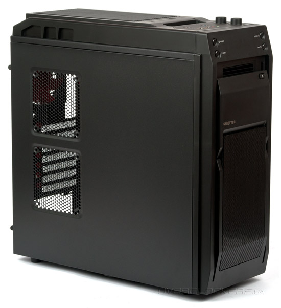 Левая боковая панель имеет два посадочных отверстия для 120-мм вентиляторов напротив видеокарты и процессорного разъема. Пылевые фильтры отсутствуют.