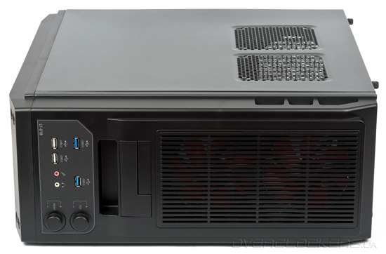 На панель внешних интерфейсов спереди, вынесены два USB 3.0, удачно расположенные далеко друг от друга. Два USB 2.0 расположены гораздо ближе друг к другу, чем хотелось бы. Само собой есть микрофонный вход и выход на наушники. И сюрприз — два встроенных реобаса, каждый из которых поддерживает подключение двух вентиляторов. Питание у них общее, от одного «молекса». К ним подключены соответственно два передних и два верхних вентилятора.