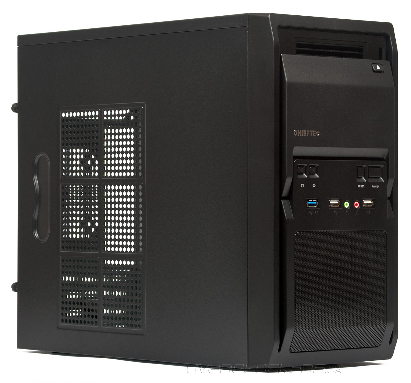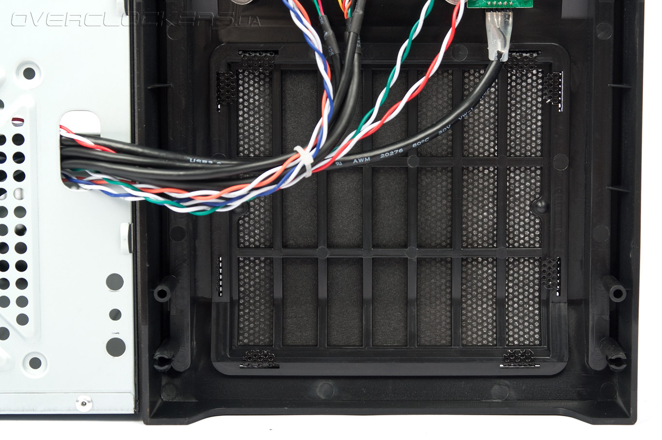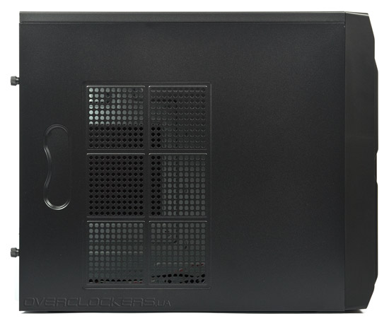 Левая панель имеет перфорацию в виде круглых ячеек, призванную облегчать доступ воздуха внутрь. Отверстия на ней рассверлены с таким шагом, что позволяют установить сюда один 120-мм или 140-мм вентилятор. Общая площадь решетки — 140 х 230 мм. Пылевого фильтра нет.