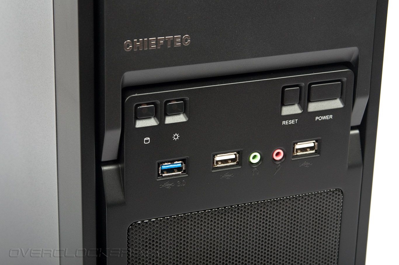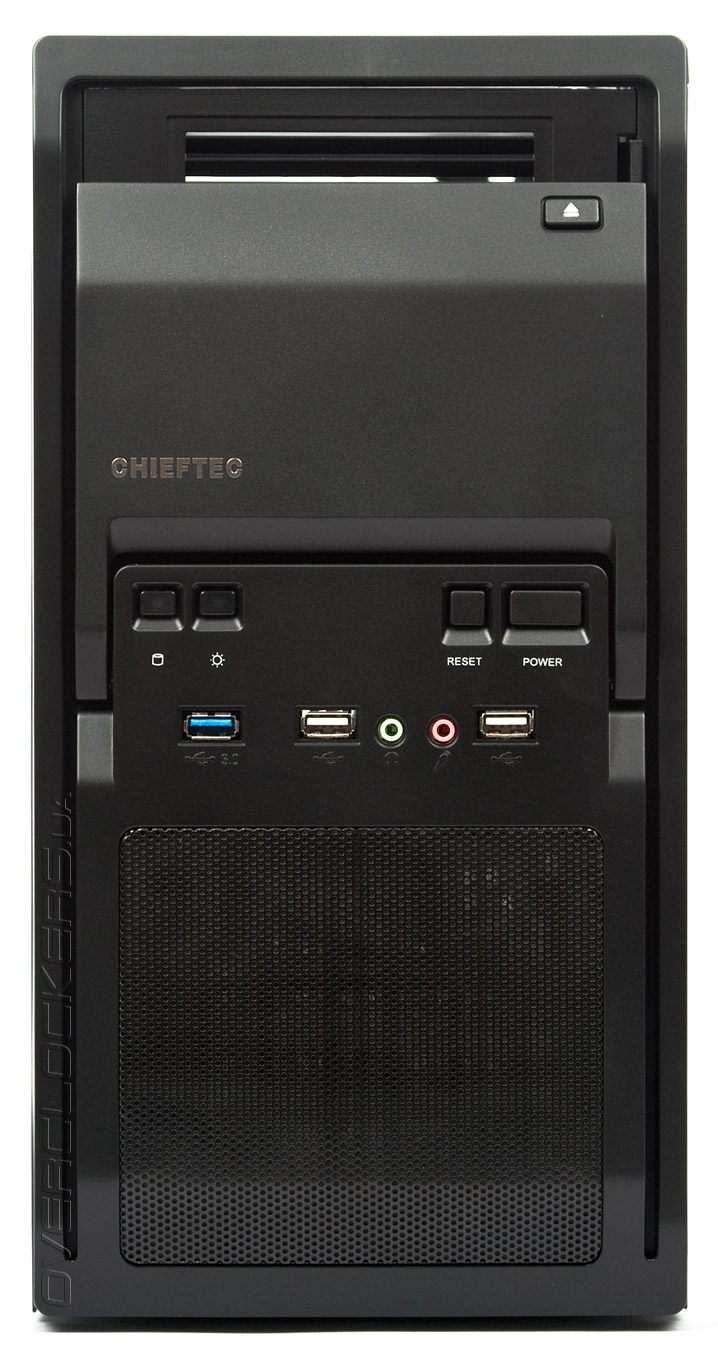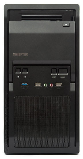 Посередине передней панели расположены органы управления. Слева два индикатора активности накопителей и питания (красного и синего цвета соответственно, свечение ненавязчивое). Справа — кнопки Reset и Power. Под ними — один порт USB 3.0, два порта USB 2.0, и аудио разъемы для наушников и микрофона. Порты находятся на достаточном удалении друг от друга, одновременное их подключение не представляет проблемы.