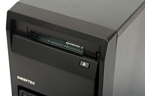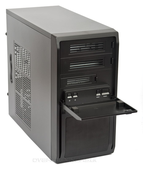 Передняя панель представляет особый интерес. Для бюджетного шасси она сделана весьма аккуратно и изысканно. Прежде всего, внимание привлекает откидывающаяся дверца, которая удерживается в закрытом состоянии двумя магнитами.