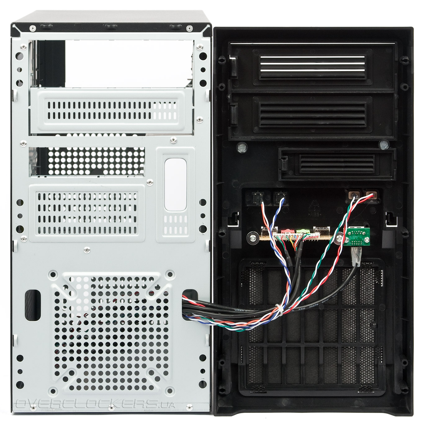 Сняв панель, мы увидим множество вентиляционных отверстий, и посадочные места для установки вентиляторов внизу, размером 120 мм, 92 мм или 80 мм. Подгонка передней панели к корпусу практически идеальна.