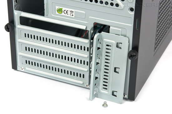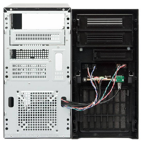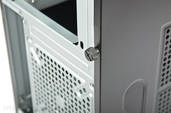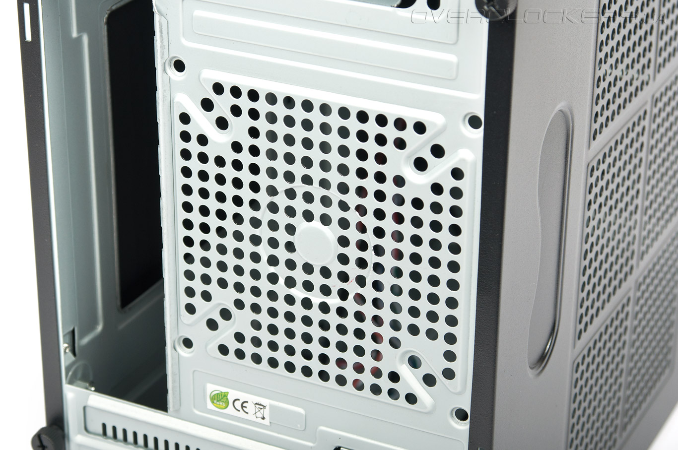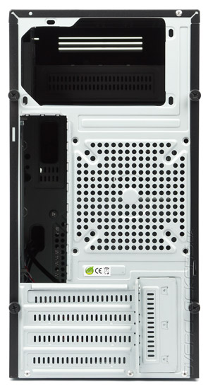 Посередине тыльной панели расположен вырез для задних портов материнской платы и посадочное место для установки одного 120-мм, 92-мм или 80-мм вентилятора. Перфорация чересчур мелкая.