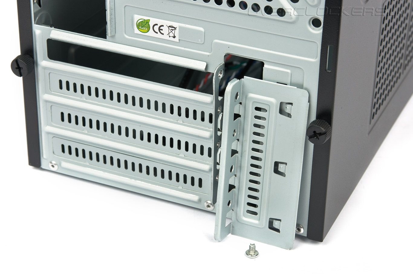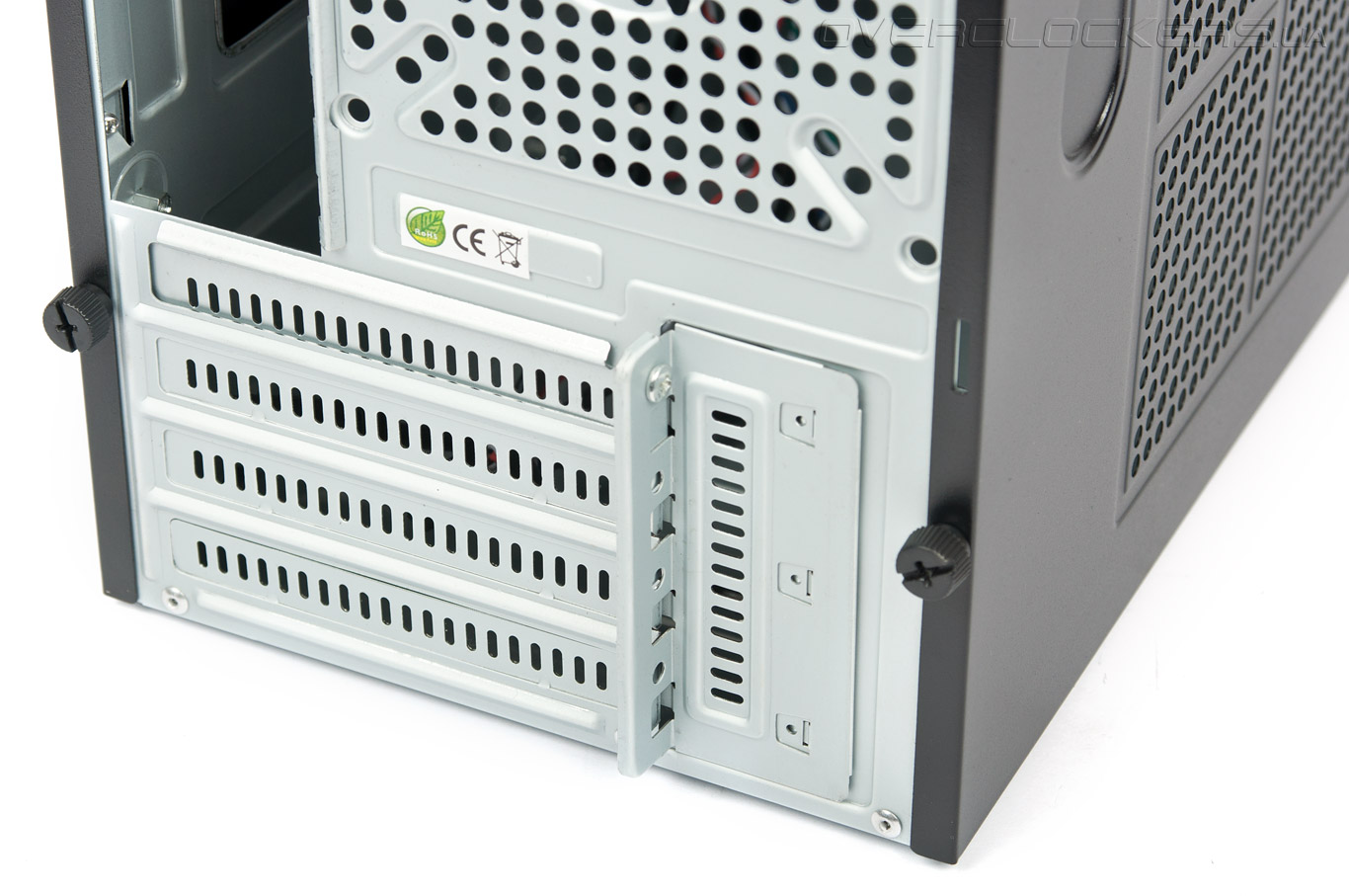 Четыре вентилируемые заглушки для плат расширения — в самом низу. Их удерживает задвижка, закрепленная на одном винте.