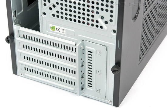 Задняя панель выполнена классически для mАTX корпусов с верхним расположением блока питания. Посадочное место под него в самом верху, возможна ориентация исключительно вентилятором вниз.