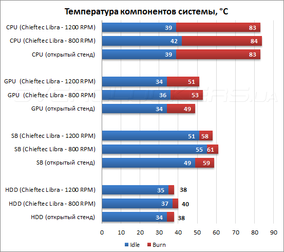 Тестирование показало, что корпус неплохо справляется с охлаждением процессора и видеокарты на условно тихих оборотах вентиляторов. Но охлаждение жестких дисков фактически отсутствует, о чем красноречиво говорит сравнение с открытым стендом. Еще нужно учесть, что общее тепловыделение системы было не самым большим. Основным источником шума, исходящего из шасси, являлись процессорный кулер и жесткий диск. Как уже упоминалось выше, вибрации от дисков передаются на шасси. Корпусные вентиляторы, относительно тихие на пониженных оборотах, начинали создавать акустический дискомфорт на повышенных оборотах из-за слишком мелкой перфорации передней и задней стенок корпуса.