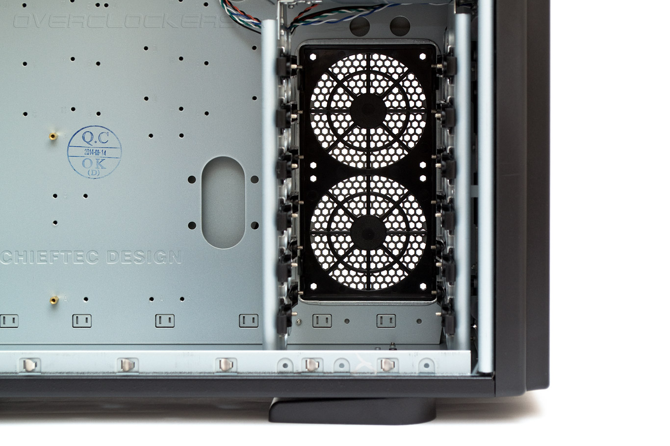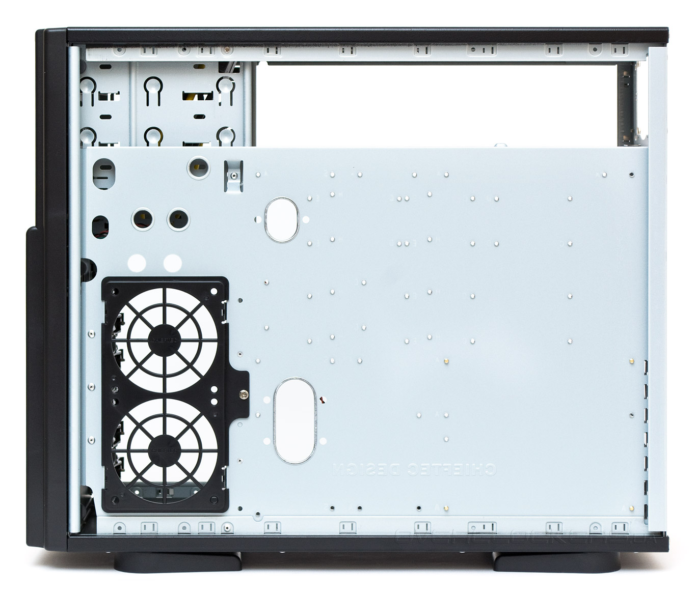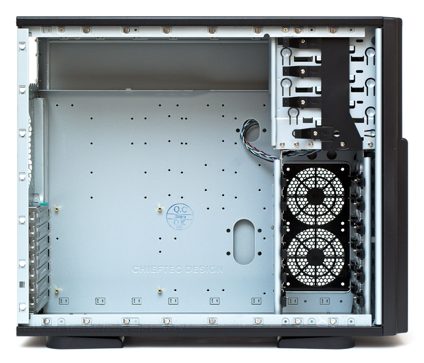 Для охлаждения корзины накопителей в специальную пластиковую обойму на левой стенке можно установить сразу два 92-мм вентилятора. Данное решение, похоже, заимствовано напрямую у серверных шасси.