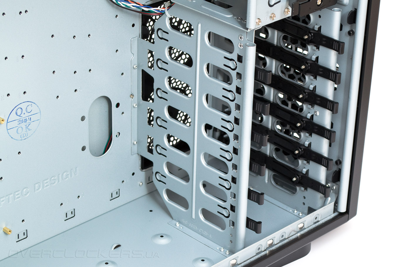 В передней части корпуса расположена стойка для шести 3,5″ жестких дисков, которые закрепляются без инструмента в специальные пластиковые салазки. Перед корзиной есть место для установки одного 2,5″ накопителя и небольшая проушина для кабельных стяжек.