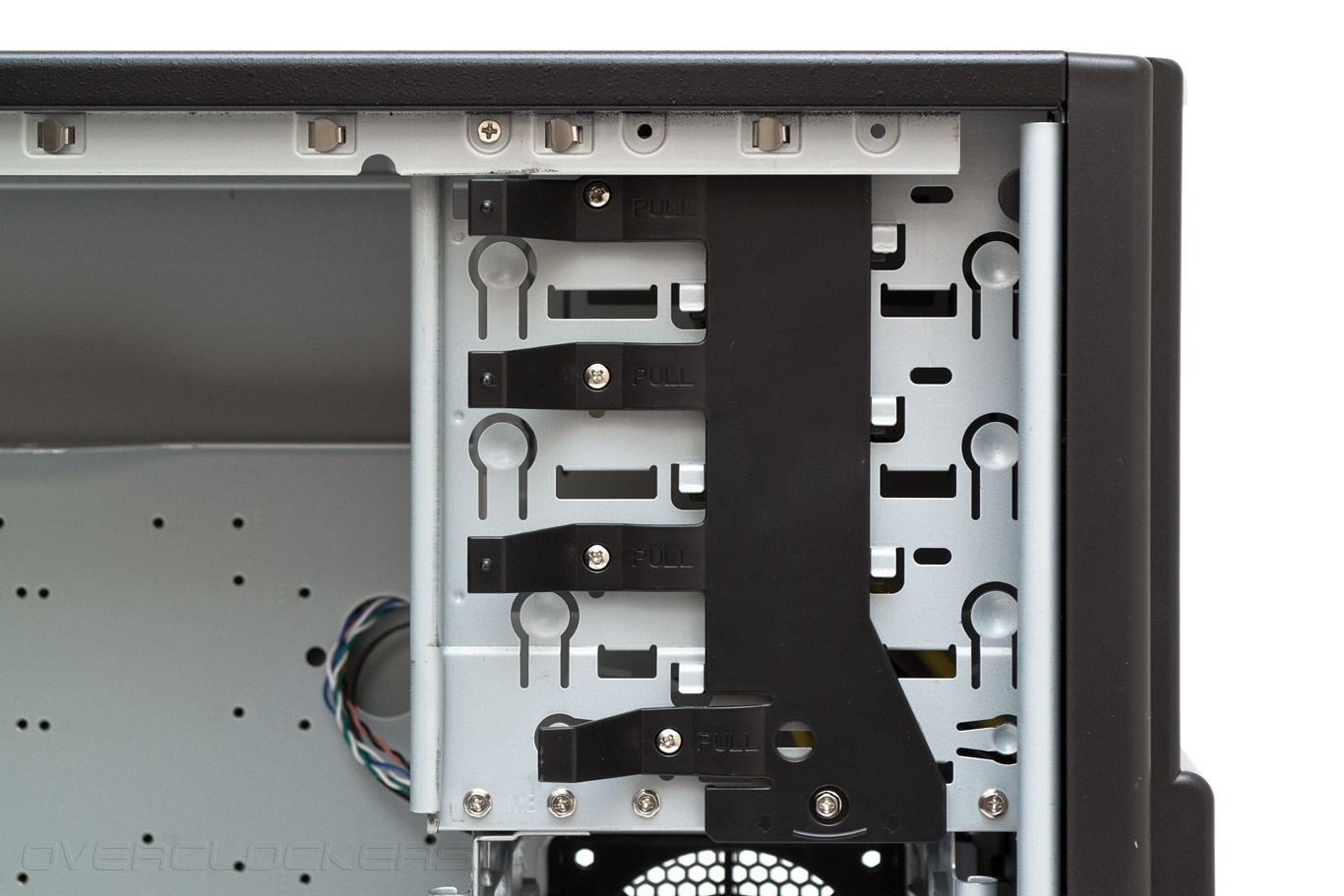 Для трех 5,25″ и одного 3,5″ устройства предусмотрены быстрые фиксаторы, действующие по принципу защелки. Для тех, кому этого мало, прямо в нижнюю часть отсеков вкручены четыре винта М3, которые можно непосредственно задействовать для крепления.