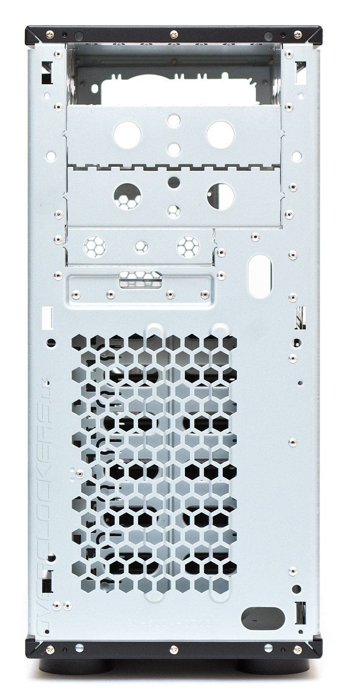 Если снять переднюю панель, увидим, что, несмотря на наличие крупных вентиляционных отверстий, места для крепления вентиляторов не предусмотрено.