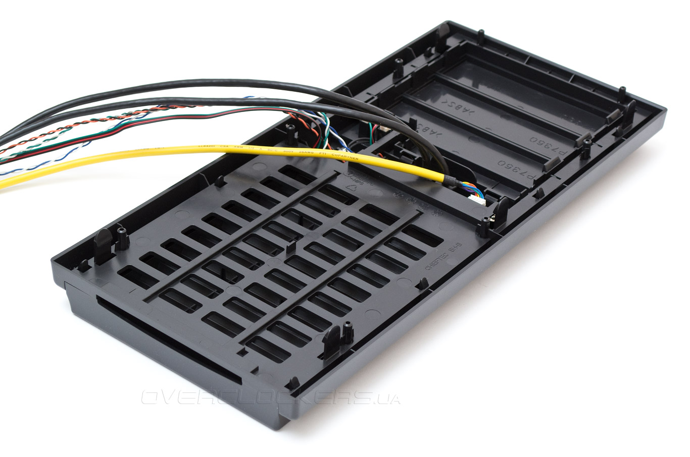 Фронтальная панель держится на шести пластиковых клипсах. Ее придется снять при сборке системы, если нужно извлечь заглушки 5,25″ и 3,5″ отсеков. К панели присоединены провода, поэтому соблюдайте осторожность при демонтаже.