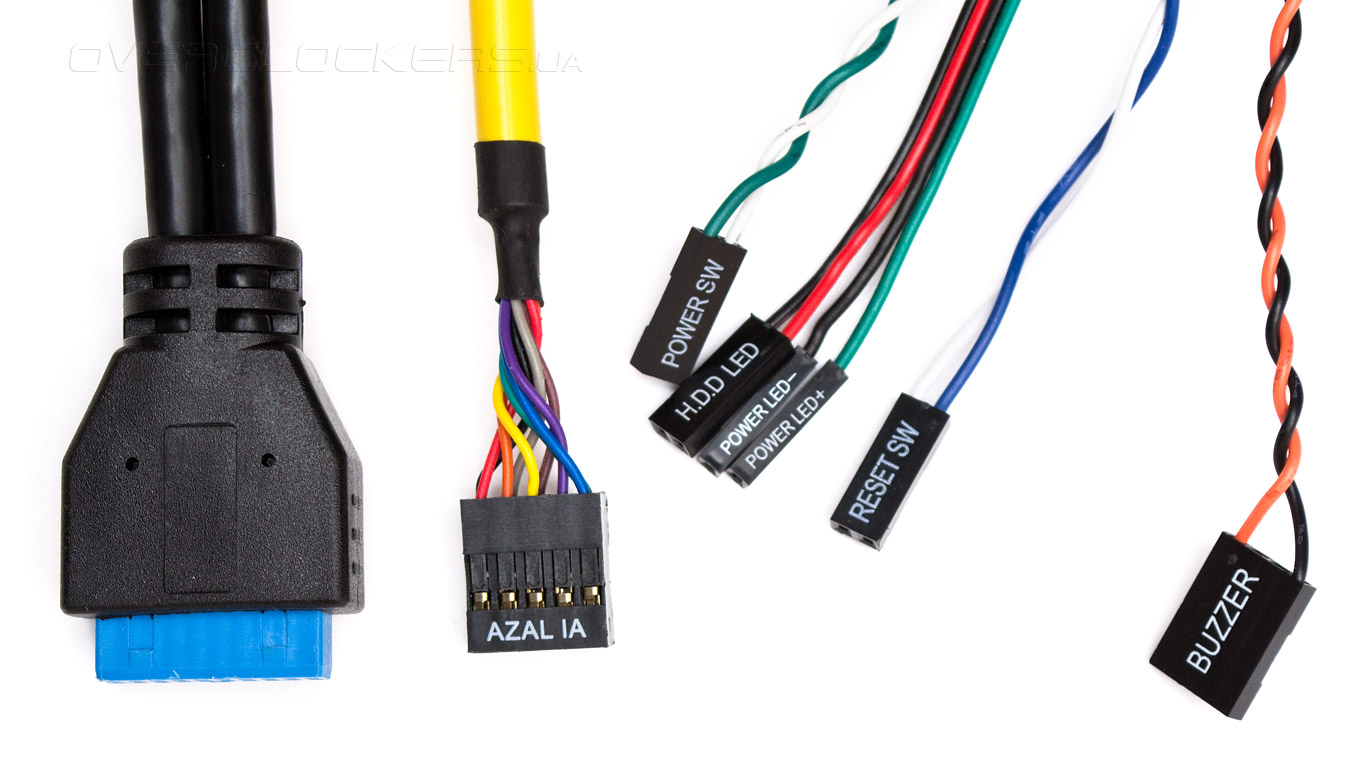 В перечень проводов входит колодка USB 3.0, кабель AC'97 (к счастью — полностью совместимый с HD Audio), провода от индикаторов активности накопителей, работы системы, кнопки запуска и клавиши перезагрузки. Порадовало и наличие шнура, ведущего к диагностическому динамику.