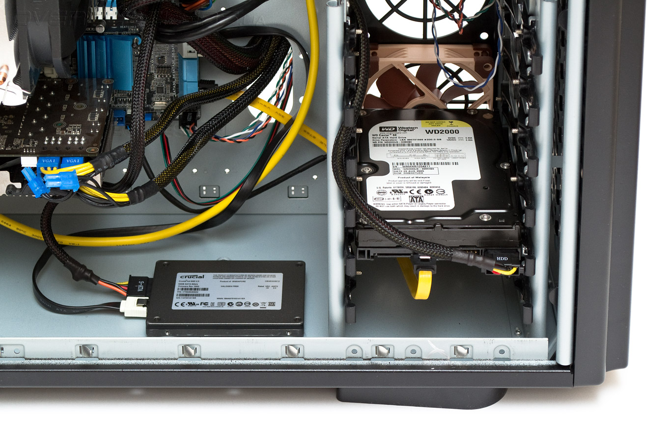 Твердотельный накопитель был привинчен на свое место внизу корпуса. Обратите внимание — для его подключения нужны исключительно прямые разъемы силового и сигнального кабеля, угловые никак не встанут. Но для жестких дисков в корзине будут желательны как раз провода с угловыми коннекторами, иначе прямые придется сильно изгибать.