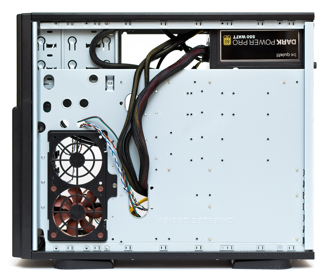 Для охлаждения корзины накопителей в специальную пластиковую обойму на левой стенке можно установить сразу два 92-мм вентилятора. Данное решение, похоже, заимствовано напрямую у серверных шасси.