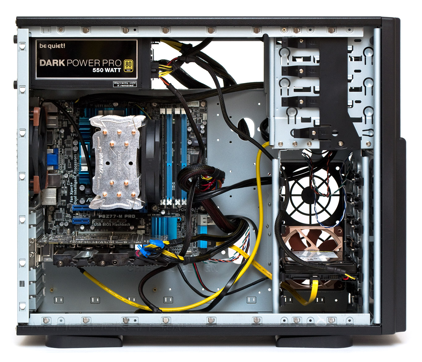 Среди достоинств — крупные внутренние габариты, позволяющие принять на борт практически любые компоненты, включая материнские платы Е-АТХ с двумя процессорами, толстая и крепкая сталь, отличное охлаждение жестких дисков и хорошее охлаждение системы при условии установки одного высокоскоростного вентилятора.