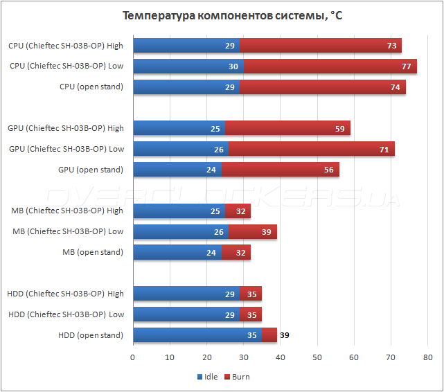 Chieftec SH-03B — это довольно закрытый корпус и потоки воздуха в нем далеки от прямоточных. Тихоходные вентиляторы явно не способны устроить здесь арктическую прохладу. Поэтому я решил опробовать два сценария использования пропеллеров — серверный (High), с лопастями, вращающимися на высоких скоростях, и настольный (Low), с вентиляторами, работающими в щадящем для ушей пользователей режиме. В режиме High, корпус полностью подтвердил свое родство с серверными шасси. Температура процессора оказалась на градус ниже, чем на открытом стенде, видеоадаптер нагрелся лишь на 3 °C больше, материнская плата осталась на том же тепловом уровне, что и на открытом стенде, а жесткий диск охлаждался просто замечательно — на шесть градусов лучше в простое и на четыре в нагрузке. При снижении скоростей пропеллеров до стандартных, мы получили три дополнительных градуса по температуре процессора, 15 по видеокарте, семь для материнской платы и только жесткие диски ощущали себя по-прежнему замечательно. Как говорится — комментарии излишни.