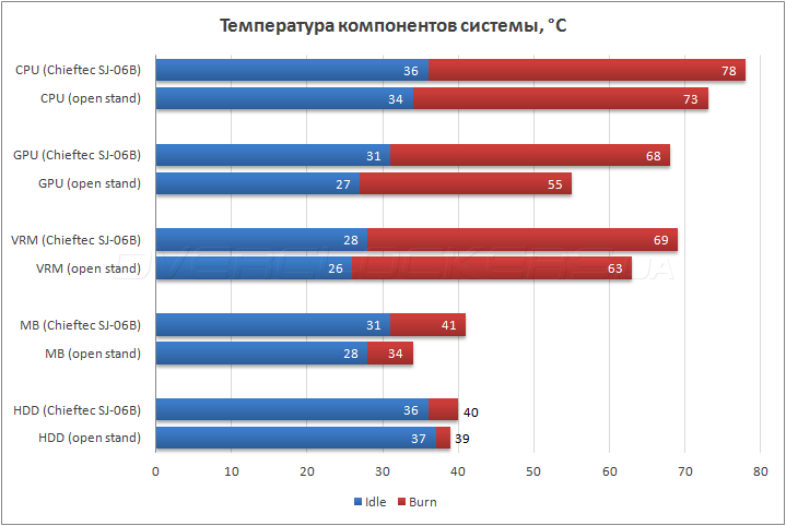 Система вентиляции в корпусе Chieftec SJ-06B я бы не назвал хорошей. Хотя с учетом того, что шасси проветривается одним единственным пропеллером, может быть что результаты и не такие негативные, как могли бы быть. Данный корпус в тепловом тесте заметно уступил открытому стенду по всем параметрам. В частности, нагрев процессора выше на пять градусов, видеокарты — на 13, цепей питания на шесть, а материнской платы на семь градусов Цельсия. И даже жесткий диск умудрился прогреться на один градус сильнее, чем на открытом стенде без обдува.