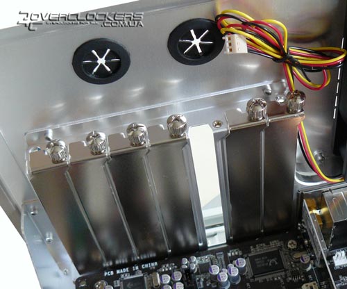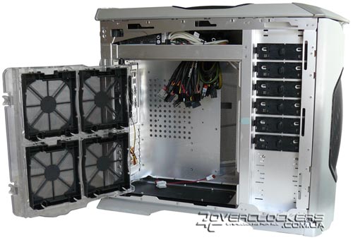 Для того чтобы попасть внутрь корпуса, кроме боковой стенки необходимо еще и открыть специальную дверку – Fan Bracket, на которой имеется четыре посадочных места под вентиляторы с размерами 80-140 мм, но имеющиеся кассеты с пылевыми фильтрами рассчитаны лишь под 120-мм вентиляторы. При необходимости, дверку можно снять, например, после установки кулера типа башни, так как она может не закрыться. Также на Fan Bracket есть посадочные места для крепления CrossFlow Fan.