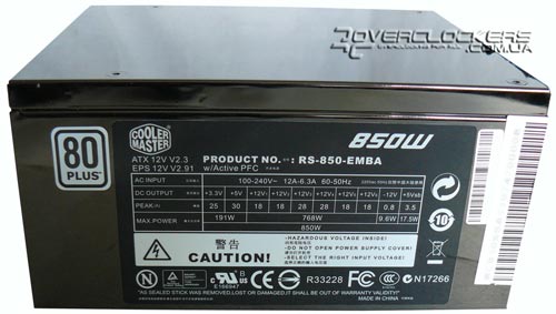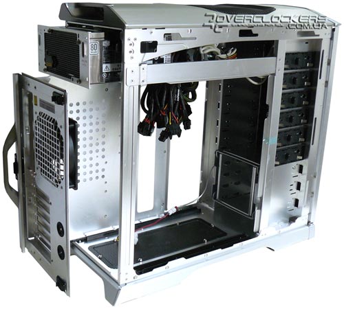 Несмотря на то, что каркас сделан из 2-мм алюминиевого листа, в верхней части корпуса имеются ребра жесткости, одновременно являющиеся направляющими для поддона под материнскую плату. Также эти ребра поддерживают блок питания – в комплекте с корпусом поставляется 850 Вт модель RS-850-EMBA, количества разъемов которой хватило бы на две системы. Судите сами: